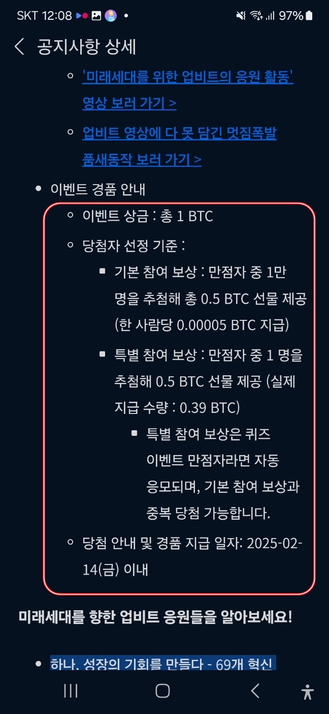 특별 추첨 : 만점자 중 1명 추첨 0.5BTC 지급(실제 지급 수량 0.39BTC)